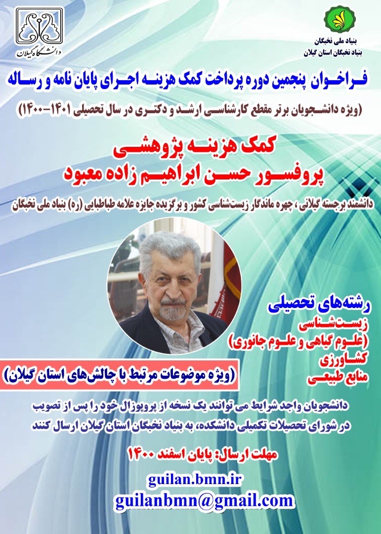 پیرو اعطای کمک هزینه پژوهشی پروفسور حسن ابراهیم زاده معبود استاد پیشکسوت دانشگاه تهران و چهره ماندگار زیست شناسی کشور و برگزیده جایزه علامه طباطبایی(ره) بنیاد ملی نخبگان و رئیس شاخه زیست­ شناسی گروه علوم پایه فرهنگستان علوم و رئیس انجمن زیست شناسی ایران به دانشجویان برتر، با همت و پشتیبانی سخاوتمندانه مالی ایشان، کمک هزینه مزبور در سال تحصیلی 1401-1400 نیز برای اجرای پایان نامه‌های کارشناسی ارشد و رساله­‌های دکتری در رشته­‌های زیست شناسی (علوم گیاهی و علوم جانوری)، علوم کشاورزی، منابع طبیعی و موضوعات مرتبط با چالش‌های استان گیلان  برقرار است. متقاضیان می‌توانند یک نسخه از پروپوزال خود را پس از تصویب در شورای تحصیلات تکمیلی دانشکده به آدرس ایمیل بنیاد نخبگان استان گیلان guilanbmn@gmail.com، ارسال نمایند. مهلت ارسال: پایان اسفند 1400  پروپوزال‌های ارسالی متقاضیان توسط اعضای کمیته علمی کمک هزینه مزبور متشکل از اعضای محترم هیات علمی دانشگاه گیلان و تعدادی از اعضای شورای علمی بنیاد نخبگان استان گیلان، مورد ارزیابی قرار خواهدگرفت. لازم به ذکر است این کمک هزینه برای پنجمین سال متوالی به دانشجویان مستعد و واجد شرایط اعطا می‌شود.
