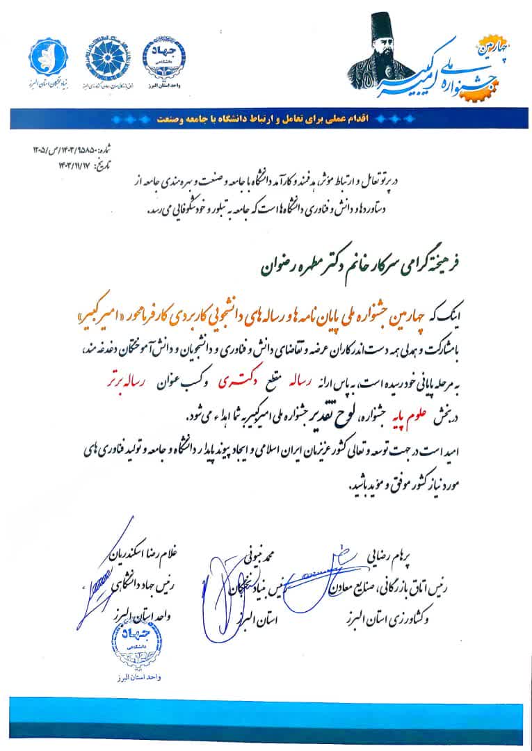 دکتر مطهره رضوان دانش آموخته رشته بیوشیمی مقطع دکتری پردیس دانشگاهی دانشگاه گیلان موفق شد در چهارمین دوره جشنواره ملی‌ امیرکبیر، عنوان رساله برتر در بخش علوم پایه را کسب کند. عنوان رساله‌ ایشان “سنتز و ارزیابی نانو ذره فریت - مس به عنوان عامل کنتراست در تصویر‌برداری رزونانس مغناطیسی” است که با راهنمایی دکتر آقا معالی عضو هیئت علمی گروه زیست‌شناسی به انجام رسانده است. چهارمین دوره جشنواره ملی‌ امیرکبیر با هدف ایجاد ارتباط میان دانشگاه، صنعت و جامعه توسط جهاد دانشگاهی البرز، اتاق بازرگانی البرز و بنیاد نخبگان سازماندهی شده و با حضور پژوهشگران، صنعتگران و کارفرمایان از سراسر کشور برگزار گردید. این جشنواره که بیش از ۱۱۰۰ پایان‌نامه و رساله از ۷۲ دانشگاه کشور را مورد ارزیابی قرار داد، چهارشنبه ۲۴ بهمن در کرج به کار خود پایان داد. دانشگاه گیلان این موفقیت را به‌ ایشان و استاد راهنما دکتر آقامعالی و جامعه دانشگاهی تبریک عرض می‌نماید. اطلاعات بیشتر درباره جشنواره‌ امیرکبیر در وبسایت رسمی این جشنواره به نشانی amirkabirfestival.ir در دسترس است.   لینک: https://www.isna.ir/photo/1403112418394/ https://www.isna.ir/news/1403112418268/ https://www.isna.ir/news/1403112418268/برگزیدگانچهارمیندورهجشنوارهملیامیرکبیرمعرفی-شدن&#1583
