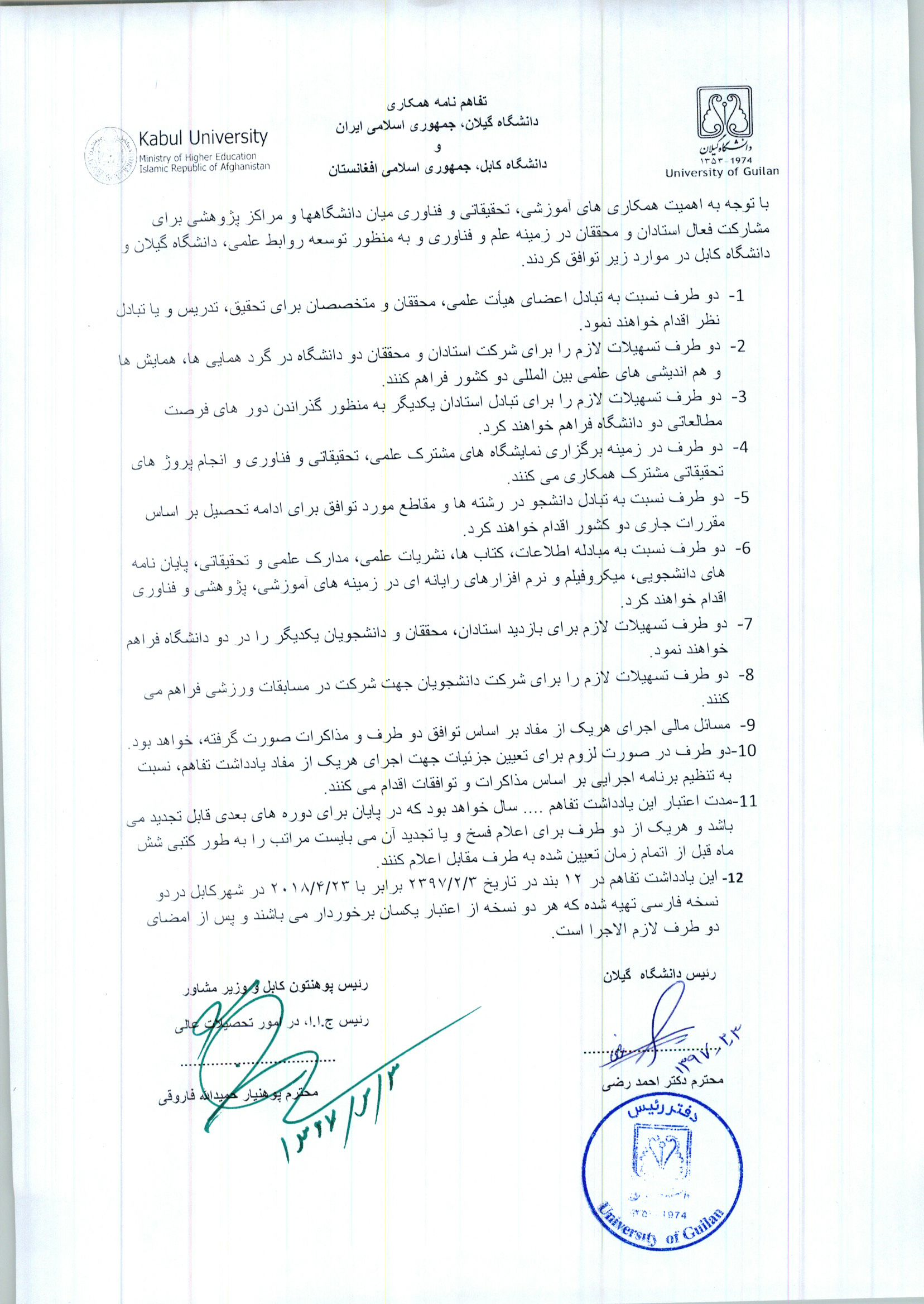 تفاهم نامه میان دانشگاه گیلان و دانشگاه کابل