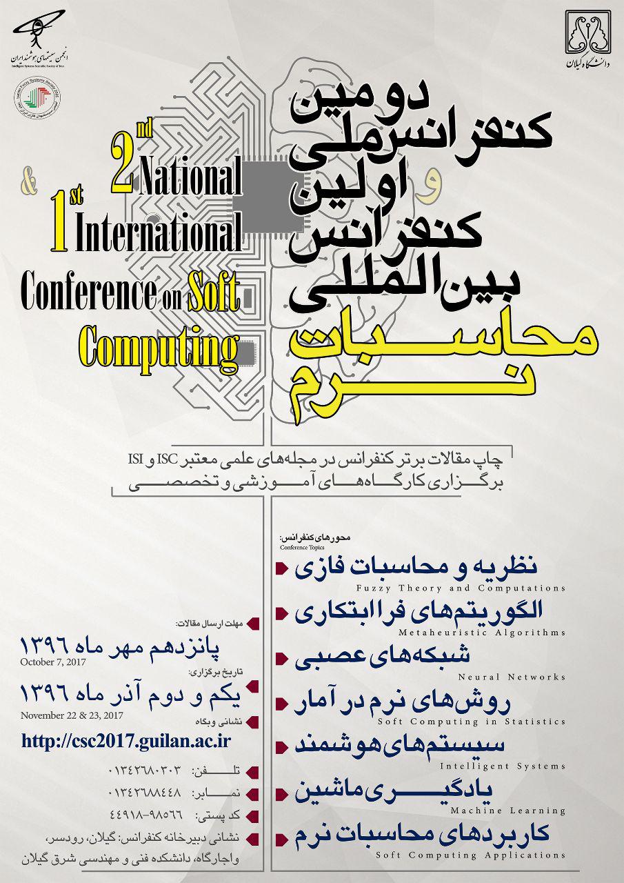 دانشگاه گیلان با همکاری انجمن سیستمهای هوشمند ایران و انجمن سیستمهای فازی ایران، دومین كنفرانس ملی و اولین کنفرانس بین المللی "محاسبات نرم" را با مجوز رسمی از وزارت علوم، تحقیقات و فناوری و پایگاه استنادی علوم جهان اسلام (ISC) در تاریخ یکم و دوم آذرماه ۱۳۹۶ در دانشکده فنی و مهندسی شرق گیلان واقع در شهرستان زیبای رودسر برگزار خواهد نمود. از این رو از کلیه پژوهشگران، اساتید، دانشجویان، صنعتگران، مدیران و صاحبنظران به منظور شرکت در این کنفرانس دعوت به عمل میآید. محورهای کنفرانس عبارتند از: